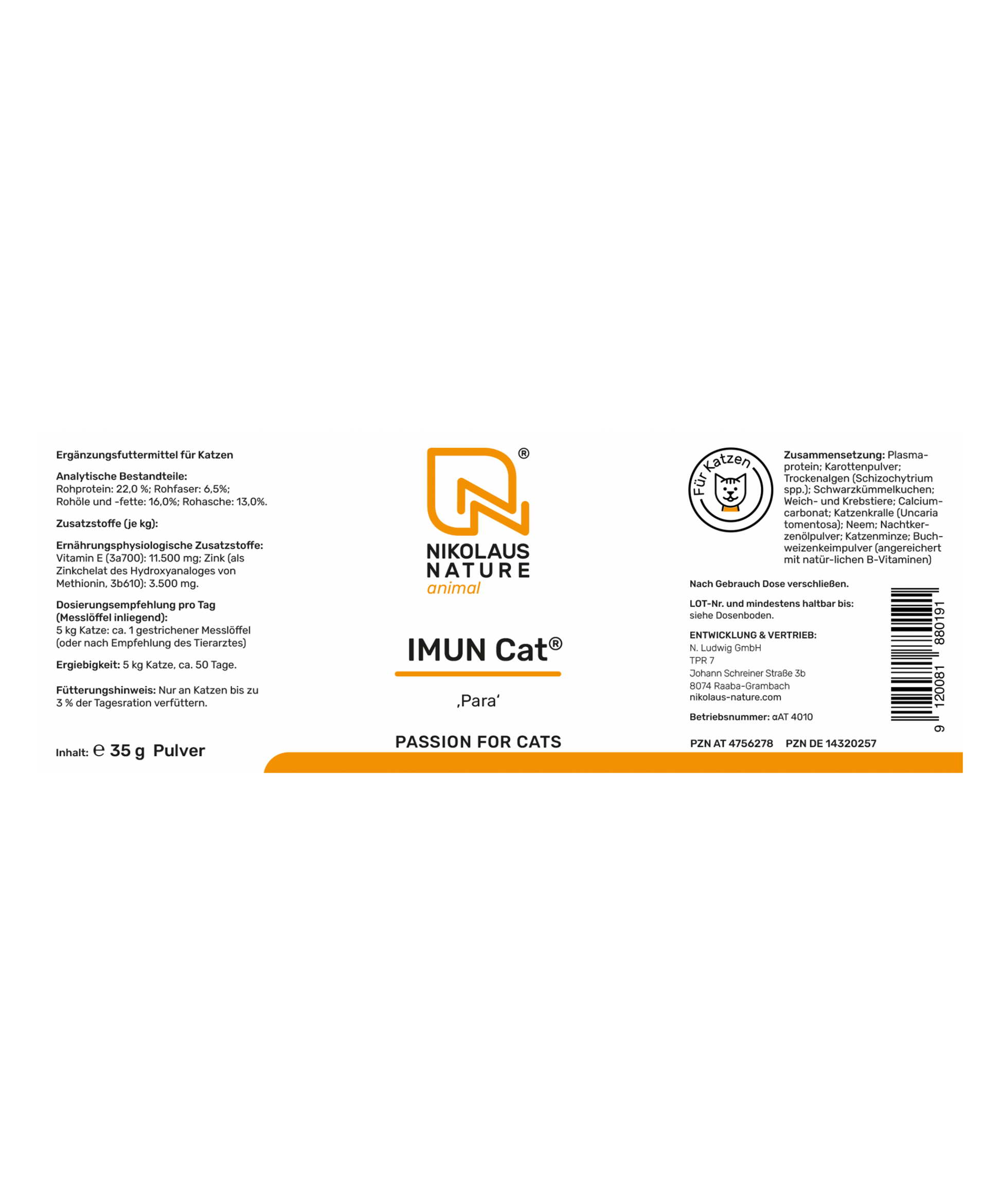 Ob Freigänger oder Stubentiger – Katzen kommen über Umweltkontakt, Futter oder andere Tiere regelmäßig mit Keimen und Lästlingen in Berührung. IMUN Cat® 'Para' ergänzt die tägliche Fütterung mit einer natürlichen Kombination aus Mikronährstoffen und Pflanzenstoffen, die in der Tierernährung traditionell zur Unterstützung der Hautschutzbarriere und der Darmflora eingesetzt werden – insbesondere während der Parasiten-Hochsaison.