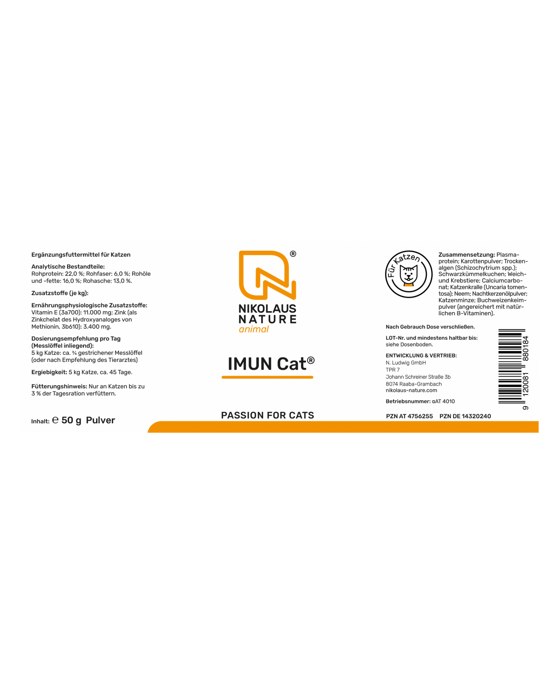 IMUN Cat® eignet sich sowohl als gezielte Immunergänzung in Phasen erhöhter Belastung, als auch zur langfristigen Unterstützung älterer Katzen oder zur Stabilisierung nach besonderen Herausforderungen. Die Pulverform kann einfach unter das tägliche Futter gemischt werden.