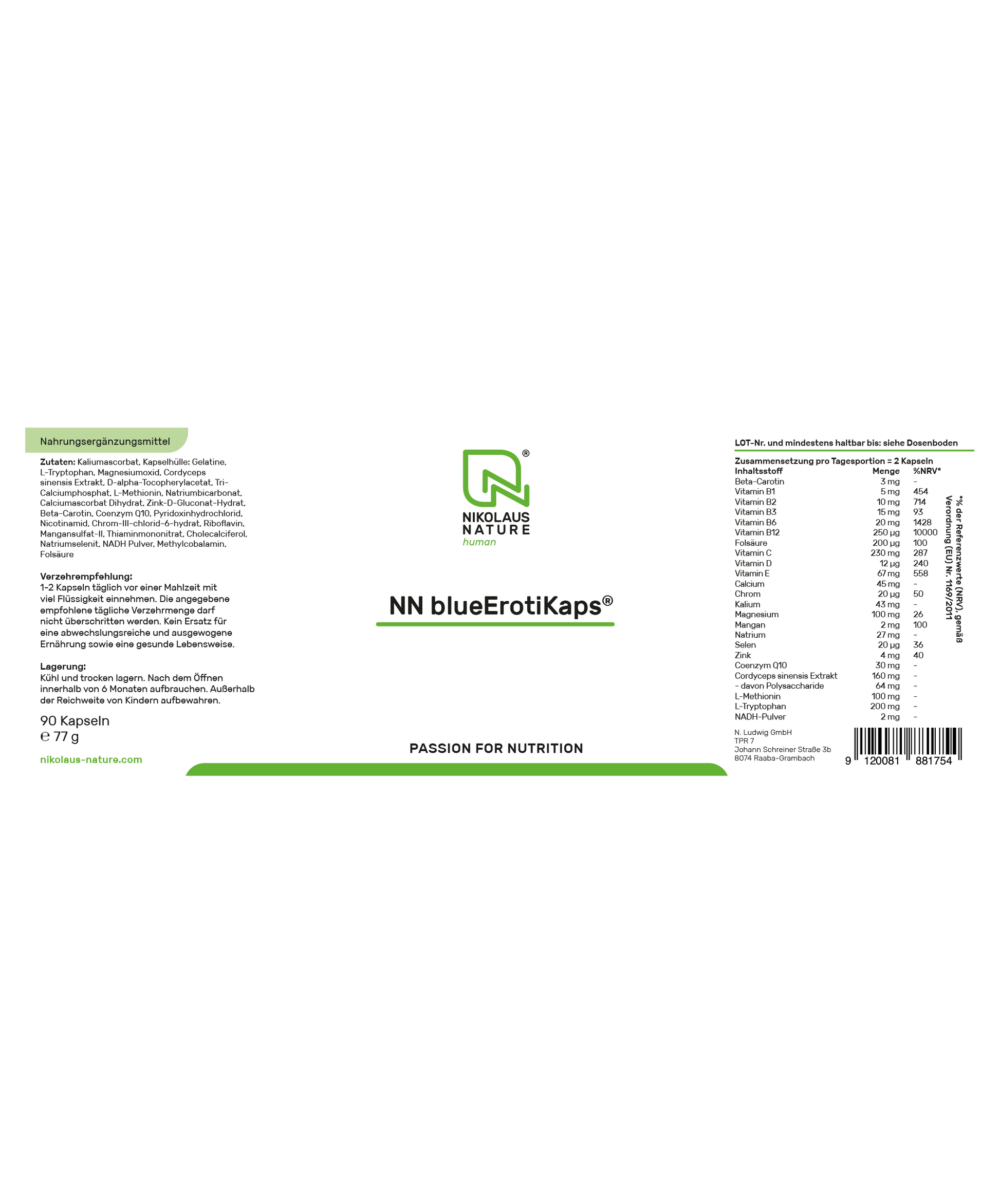 Neben den klassischen Vitaminen und Mineralstoffen enthält NN blueErotiKaps® auch ausgewählte Spezialstoffe wie Cordyceps sinensis, Coenzym Q10, NADH sowie die Aminosäuren L-Tryptophan und L-Methionin. Cordyceps gilt traditionell als Tonikum für Energie und Vitalität und wird in Asien seit Jahrhunderten geschätzt.