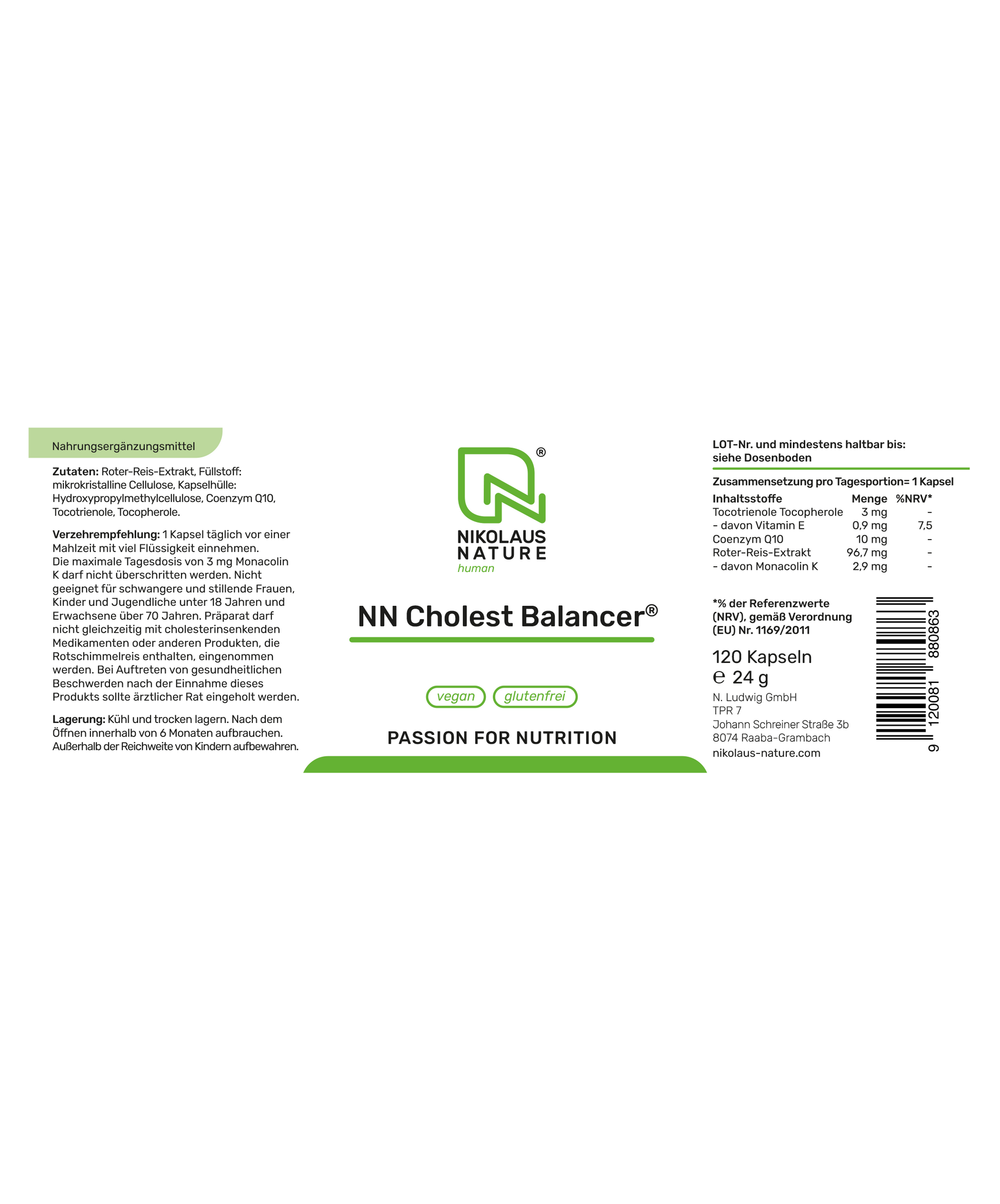 Cholesterin ist lebenswichtig – und wird zum Großteil vom Körper selbst gebildet. Dennoch kann ein dauerhaft erhöhter LDL-Wert das Risiko für Herz-Kreislauf-Erkrankungen steigern. NN Cholest Balancer® bietet dir eine rein pflanzliche Möglichkeit, deinen Cholesterinspiegel in Kombination mit einer bewussten Ernährung und Bewegung positiv zu beeinflussen.
