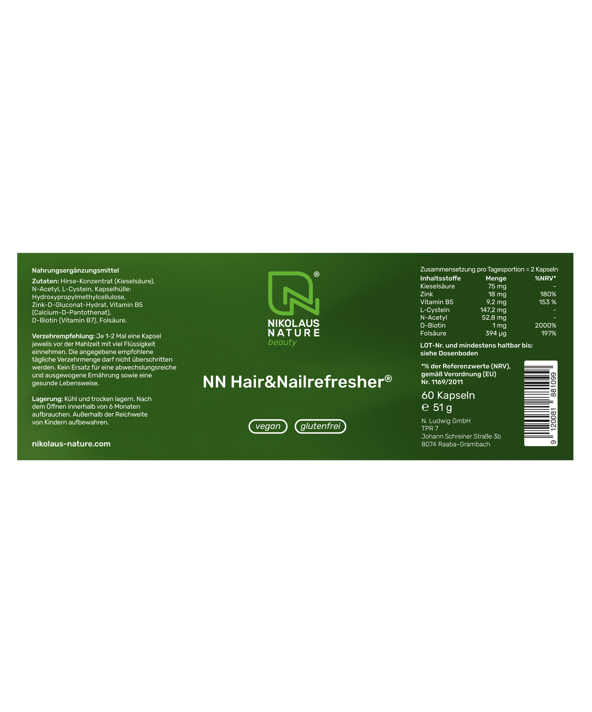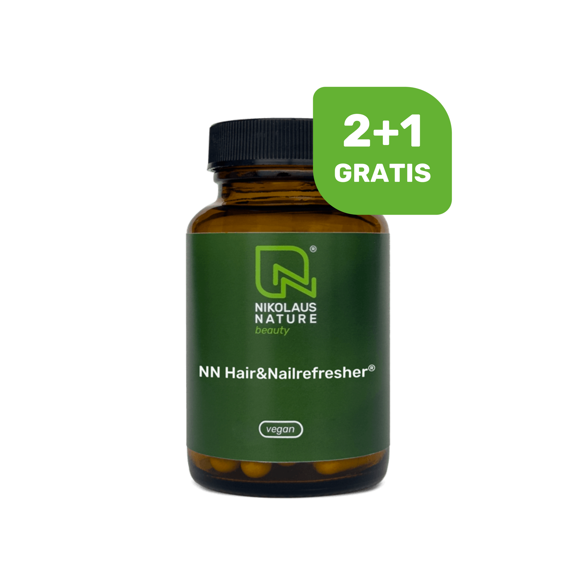 Unser äußeres Erscheinungsbild ist eng mit unserer Nährstoffversorgung verknüpft. Stress, unausgewogene Ernährung und Umwelteinflüsse können Spuren hinterlassen. NN Hair&Nailrefresher® liefert gezielt Mikronährstoffe wie Zink, Biotin, Folsäure und Vitamin B5 – kombiniert mit Kieselsäure aus Hirsekonzentrat und L-Cystein zur Unterstützung von Haut, Haaren und Nägeln.