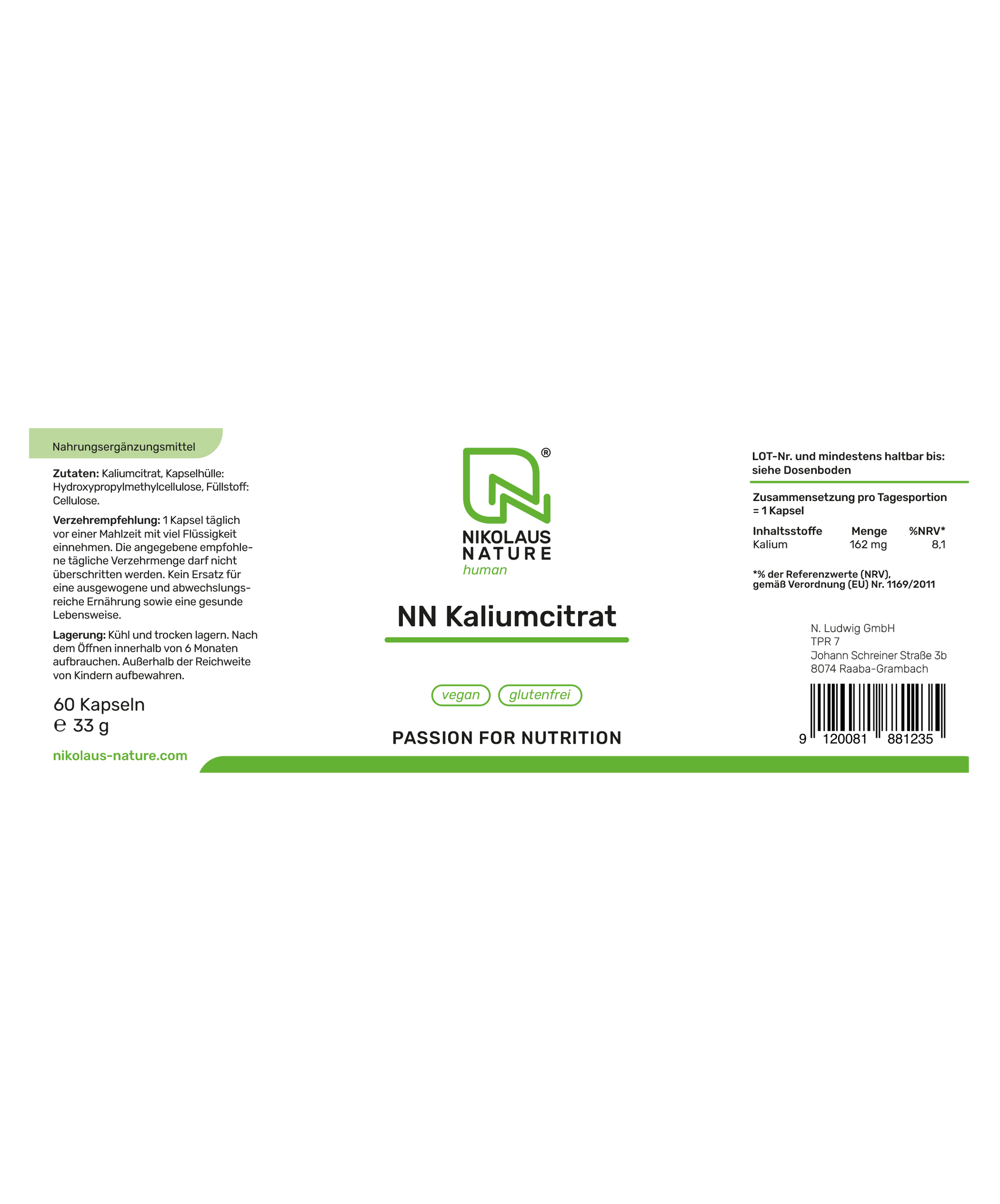 Kalium gehört zu den essenziellen Mineralstoffen und spielt eine Schlüsselrolle für die elektrische Reizweiterleitung im Nervensystem, die Muskelfunktion und den Blutdruck. NN Kaliumcitrat liefert Kalium in einer gut bioverfügbaren Form – dem Kaliumsalz der Zitronensäure – für eine gezielte Versorgung, auch bei erhöhter körperlicher Aktivität.