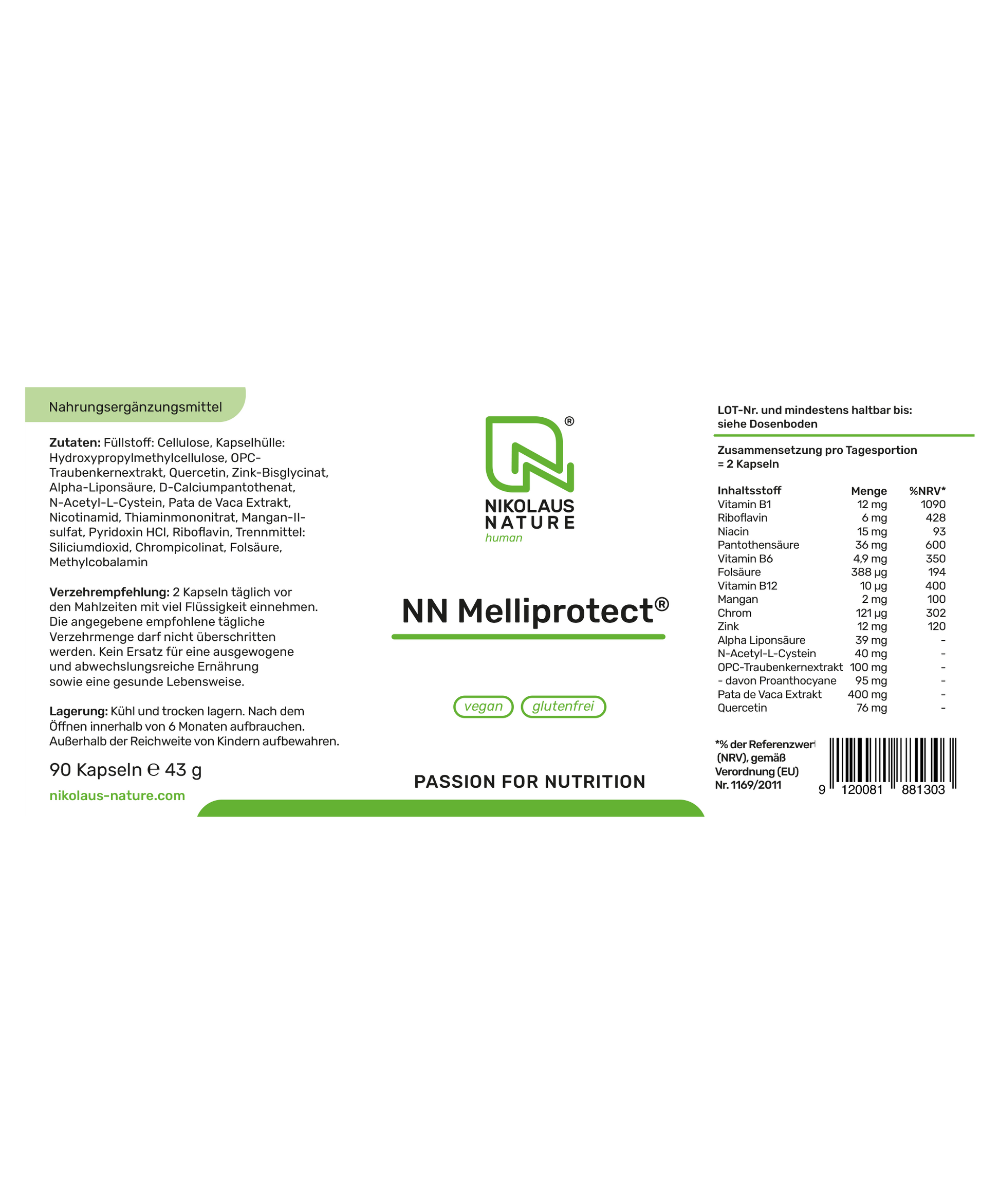 In stressigen Zeiten, nach üppigen Mahlzeiten oder durch unausgewogene Ernährung kann der Blutzuckerspiegel aus der Balance geraten. NN Melliprotect® kombiniert gezielt Mikronährstoffe und sekundäre Pflanzenstoffe, die den Kohlenhydratstoffwechsel unterstützen und zur Aufrechterhaltung eines normalen Blutzuckerspiegels beitragen – Tag für Tag.