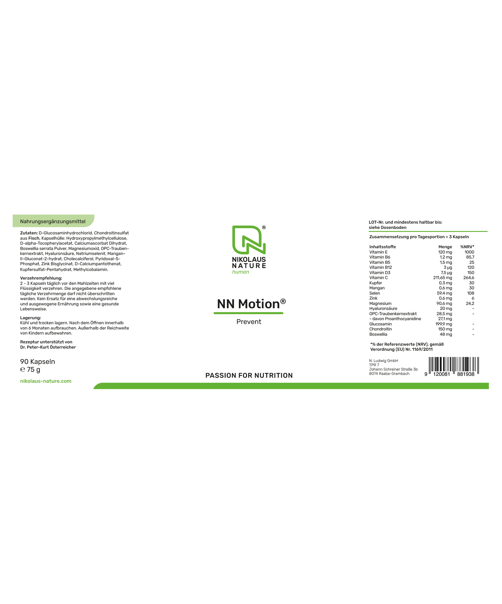 Ob Alltag, Sport oder Alter – unser Bewegungsapparat steht täglich unter Belastung. Knochen, Knorpel, Gelenke und Bindegewebe sind auf eine gezielte Versorgung mit Nährstoffen angewiesen, um langfristig mobil zu bleiben. NN Motion® Prevent liefert dir eine ganzheitlich abgestimmte Kombination aus strukturellen Bausteinen und antioxidativen Mikronährstoffen – ideal zur täglichen Ergänzung.