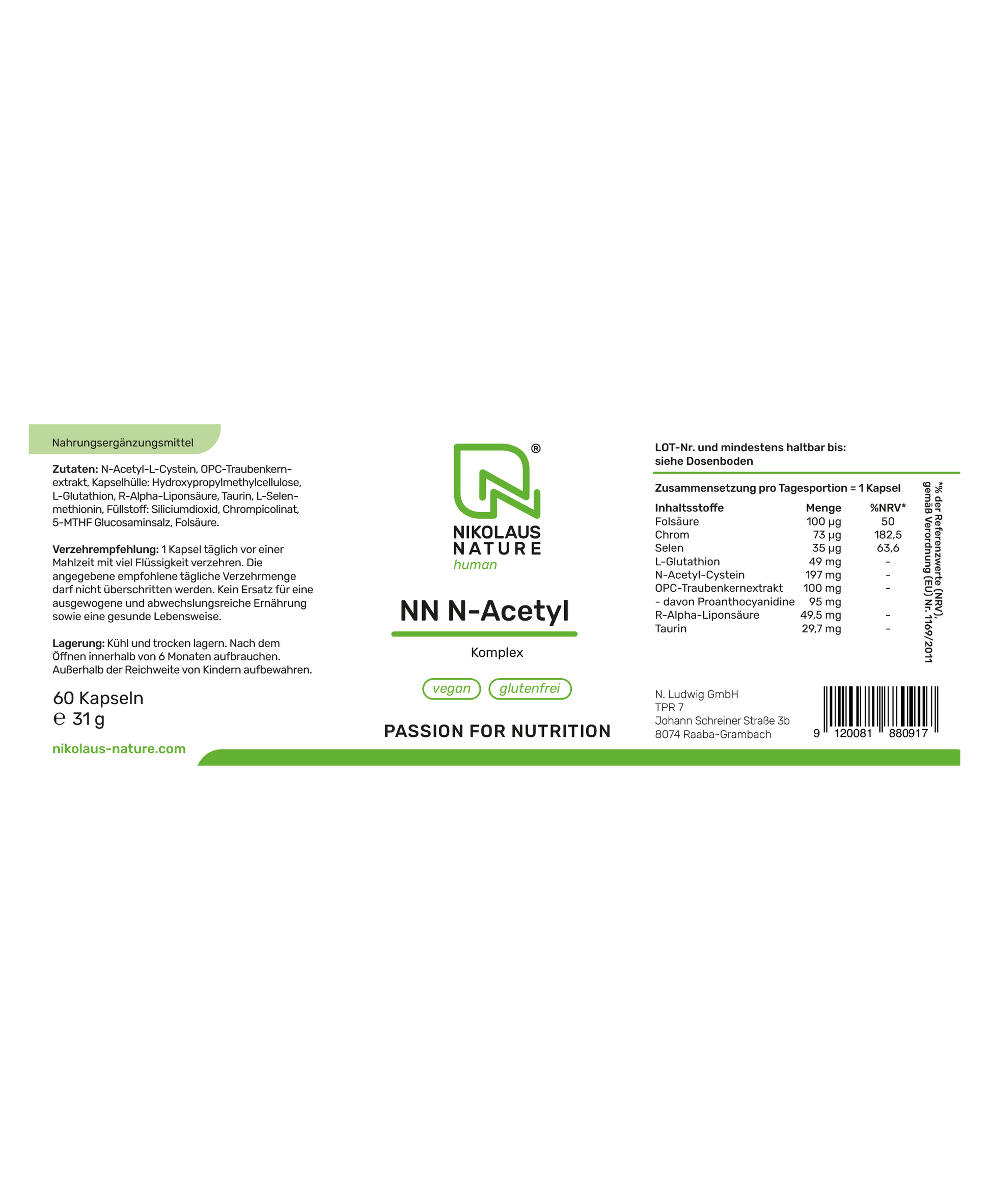 N-Acetyl-L-Cystein – kurz NAC – ist eine bioaktive Form der Aminosäure Cystein und ein direkter Vorläufer von Glutathion. Dieses körpereigene Tripeptid gilt als eines der wichtigsten Antioxidantien in unseren Zellen. NN N-Acetyl Komplex kombiniert NAC mit weiteren antioxidativen Mikronährstoffen wie OPC, R-Alpha-Liponsäure, Glutathion und Vitaminbegleitern wie Folsäure und Chrom.