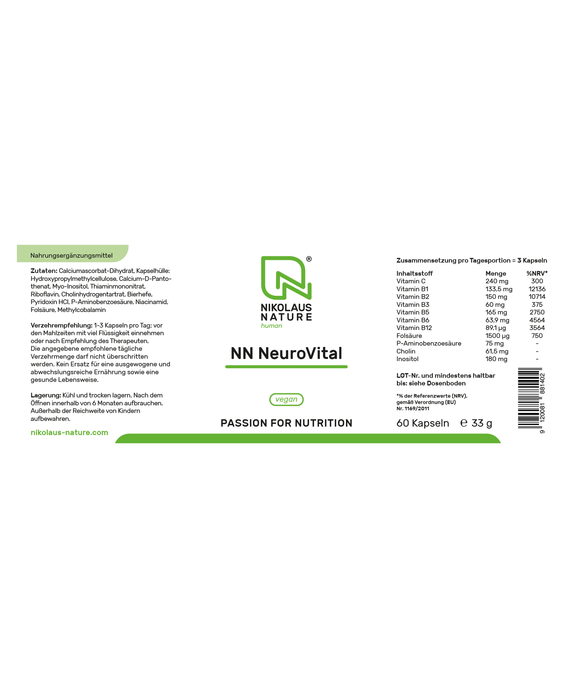 Ob im Beruf, im Studium oder im Alltag – das Gehirn ist im Dauereinsatz. Damit es leistungsfähig und belastbar bleibt, braucht es eine gezielte Versorgung mit Vitaminen und Mikronährstoffen. NN NeuroVital liefert eine umfassende Kombination aus allen B-Vitaminen, ergänzt durch Vitamin C, Cholin, Inositol und PABA – abgestimmt für mentale Leistung, Nervenfunktion und kognitive Klarheit.