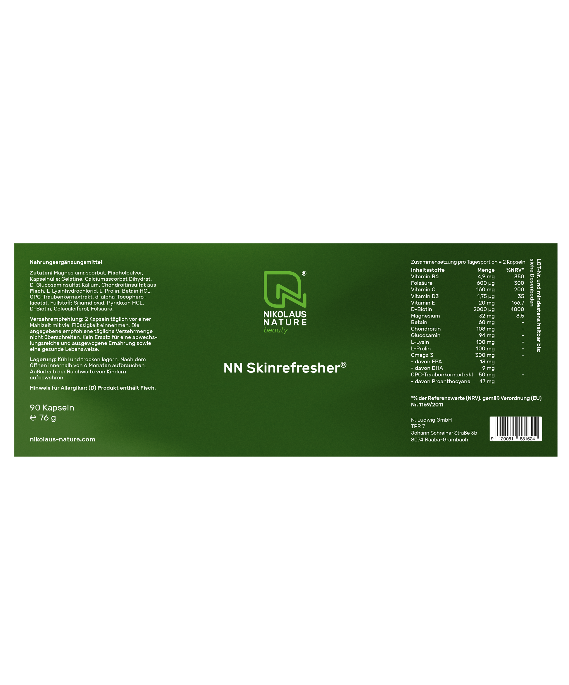 NN Skinrefresher® enthält eine ausgewogene Kombination aus Biotin, Vitamin C, Vitamin E und weiteren bioaktiven Substanzen. Die enthaltenen Omega-3-Fettsäuren unterstützen den Feuchtigkeitshaushalt, während OPC aus Traubenkernextrakt und Vitamin E dabei helfen, die Zellen vor oxidativem Stress zu schützen. Biotin trägt zur Erhaltung normaler Haut bei – ein echtes „Hautvitamin“.