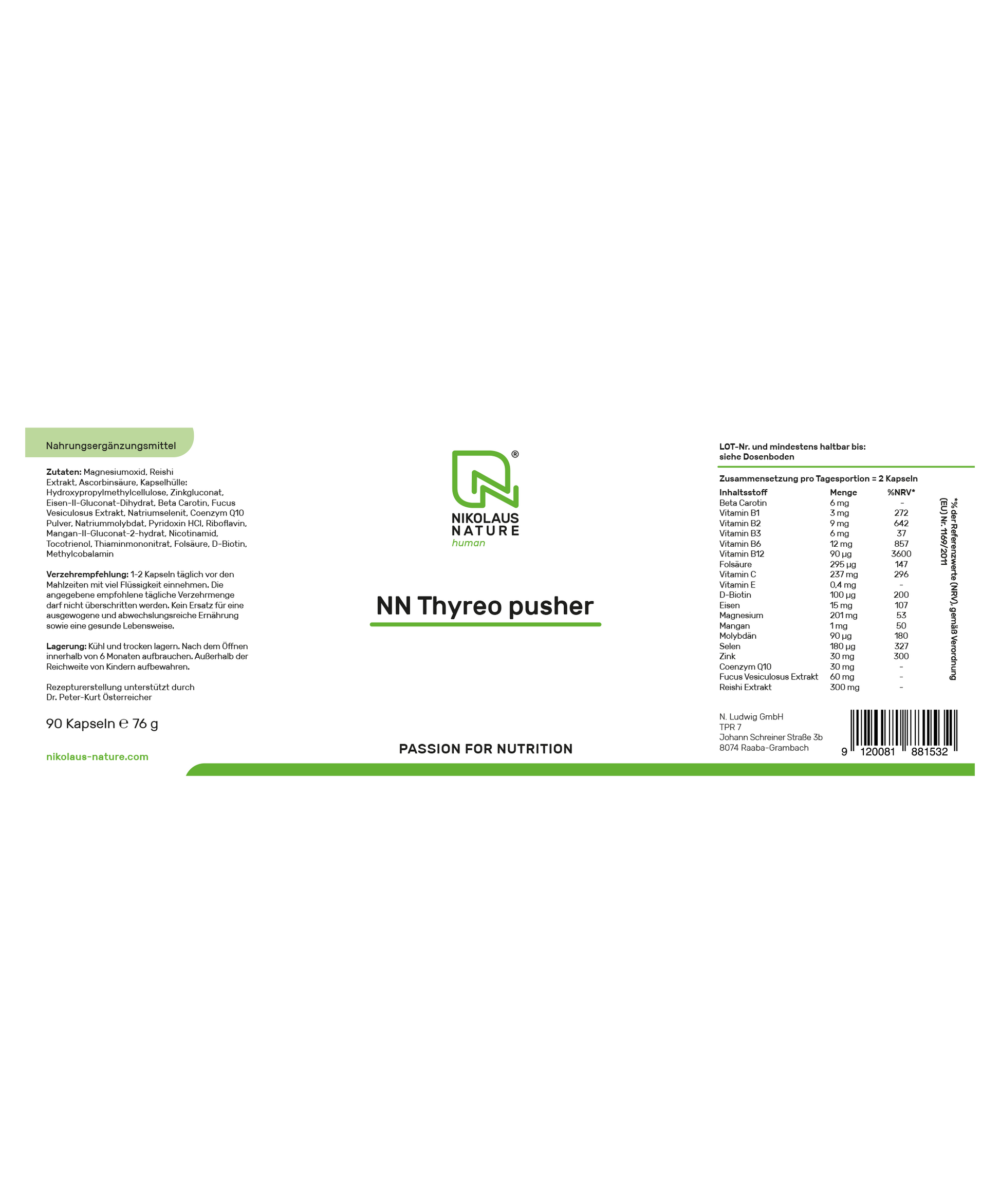 NN Thyreo Pusher® enthält Fucus vesiculosus (Blasentang), eine pflanzliche Jodquelle. Jod trägt zur normalen Produktion von Schilddrüsenhormonen und zur normalen Funktion der Schilddrüse bei. Ergänzt wird die Rezeptur durch Selen, Eisen, Zink, Magnesium und zahlreiche B-Vitamine – alle abgestimmt auf eine optimale Versorgung des empfindlichen Schilddrüsengewebes.