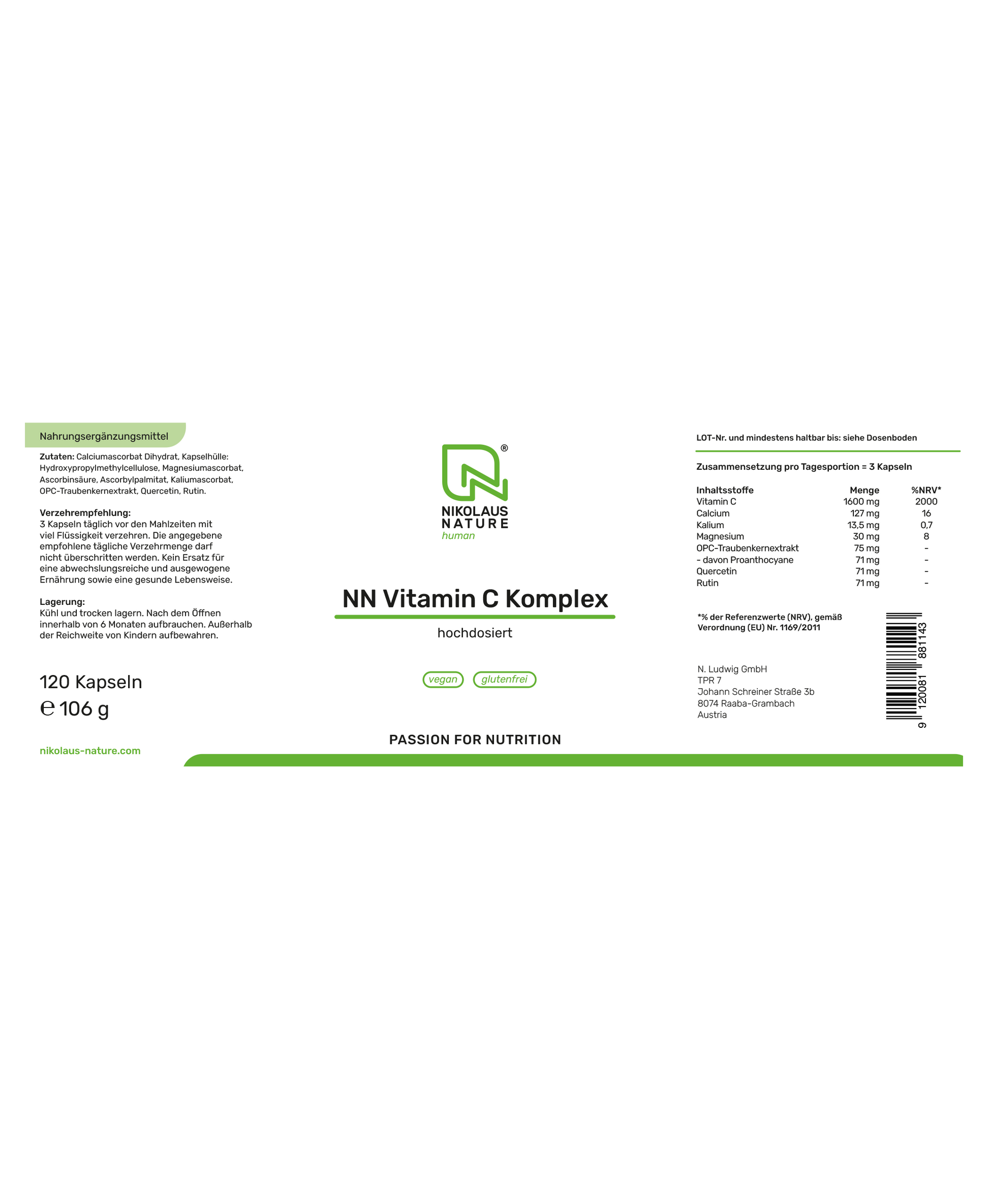 Mit einer Tagesdosis von 1.600 mg ist NN Vitamin C Komplex besonders hochdosiert. Enthalten sind neben Ascorbinsäure auch gut verträgliche, gepufferte Formen wie Calciumascorbat, Magnesiumascorbat und Kaliumascorbat. Ergänzt wird die Rezeptur durch sekundäre Pflanzenstoffe wie OPC aus Traubenkernen, Quercetin und Rutin – eine sinnvolle Kombination für ganzheitliche Unterstützung.