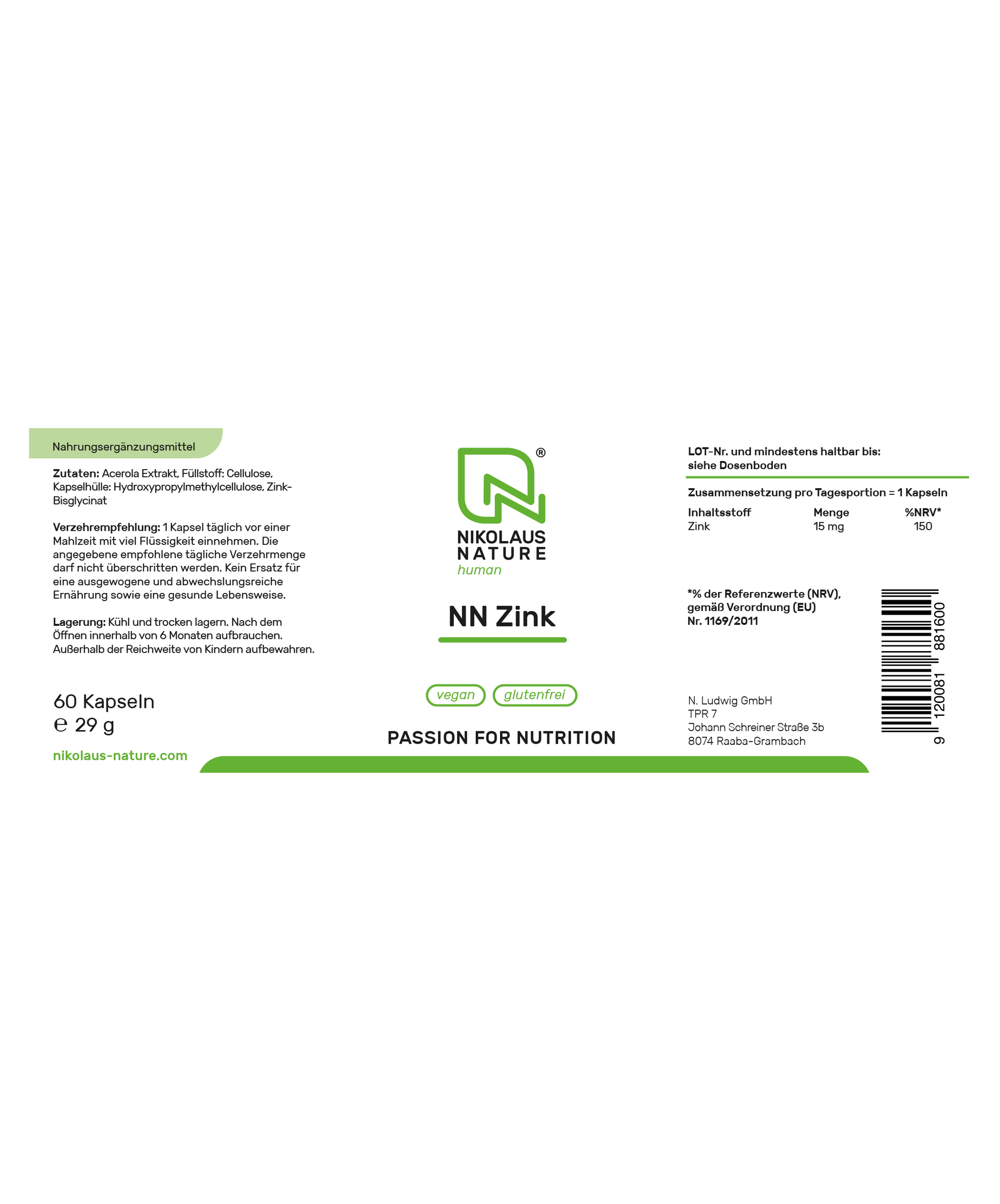 Da Zink im Körper nicht gespeichert werden kann, ist eine kontinuierliche Zufuhr über die Ernährung oder Supplemente besonders wichtig. Vegetarier:innen, Senior:innen oder Personen mit erhöhtem Bedarf profitieren dabei besonders von gut bioverfügbarem Zink. NN Zink enthält hochwertiges Zink-Bisglycinat – eine organisch gebundene Form mit besonders hoher Aufnahmefähigkeit – ergänzt durch Vitamin C aus Acerola.